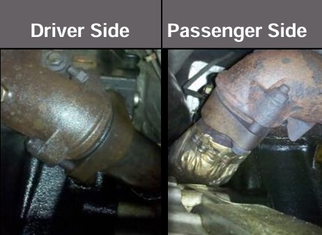 7.  Remove the (2) bolts using a 10mm and a 13mm wrench/socket from the up-pipe to manifold at both the drivers and the passenger side of the engine.