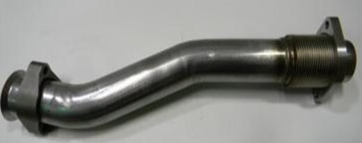 9.  Assemble the passenger side bellowed up-pipe (double bent pipe) to the collector using (1) metal gasket and (2) short bolts from the kit. Use anti-seize lubricant on the bolts and the flanges prior to tightening up the bolts fully.