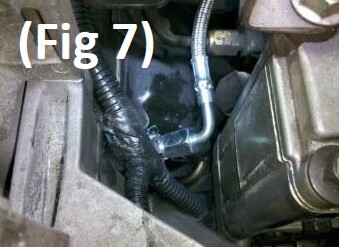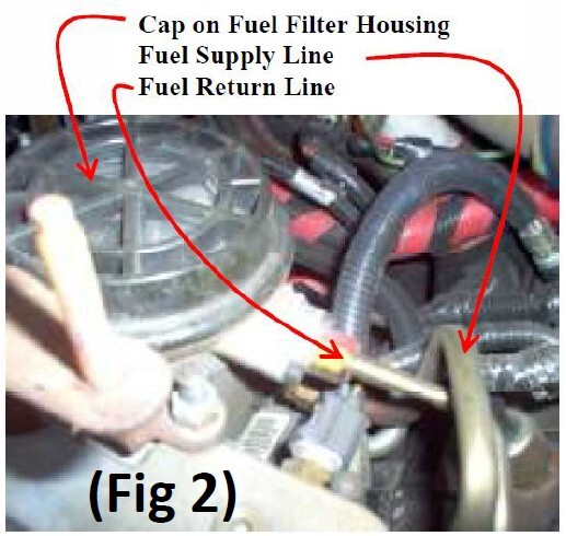 3. Disconnect the Fuel Return line from the right (driver) side of the fuel filter housing (#2 in Ref. Schematic), which is connected at a point almost directly above the line feeding the fuel filter housing.