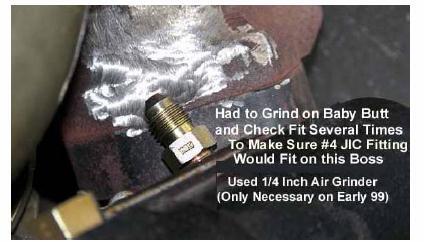 NOTE: If you have an early ’99 model engine, you will need to grind some off the up-pipe collector to make room for the fittings.