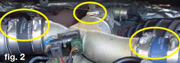 SUGGESTION: BE PREPARED TO TIGHTEN, OR AT LEAST CHECK THE TIGHTNESS OF ALL HOSE/BOOT CLAMPS WHILE YOU’RE UNDER THE HOOD, ESPECIALLY THE CLAMP AROUND THE DOWNPIPE CONNECTION ON THE DISCHARGE SIDE OF THE TURBO EXHAUST HOUSING.