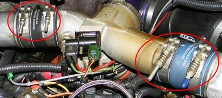 19.  Align the drivers and passenger side CAC pipes with the spider and install the boots onto the spider. Tighten clamps to 60 in-lbs.