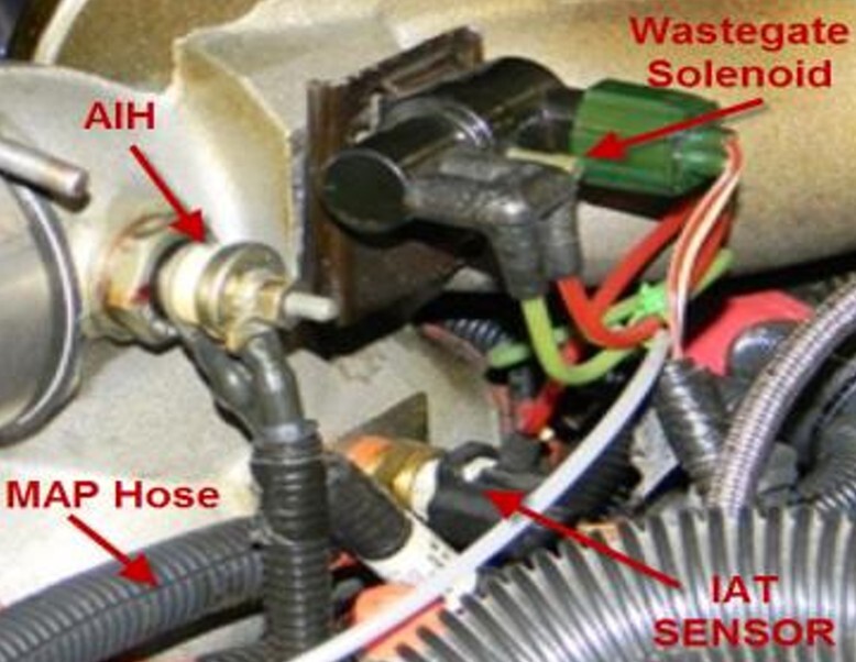 18.  Re-connect the AIH leads, IAT sensor connector, MAP & waste-gate pressure hoses, & install the waste-gate solenoid from the spider.