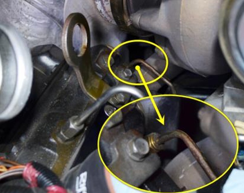 6.  Locate the passenger side fuel line running from the fuel bowl along the head. It is a ¼” steel line that runs along the head and turns behind the head.