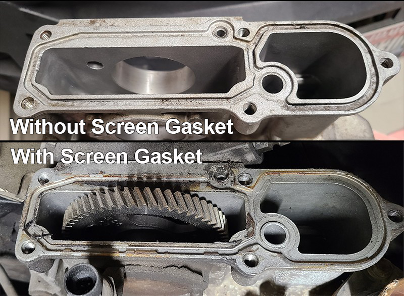 The image below shows both types of front covers. The earlier model, without provisions for the screen gasket, is on the top, while the later Super Duty style is below it. Notice the flat surface on the right side on the lower cover. This was removed to allow room for the screen gasket sometime around 1999-2000.