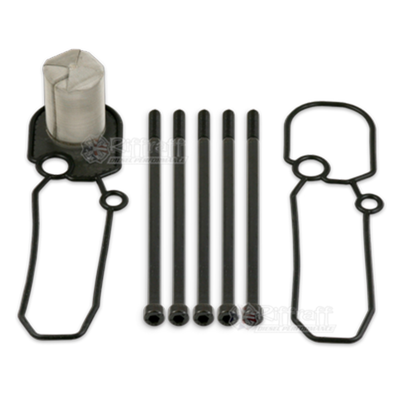 Riffraff Diesel’s Patented Billet Mini Reservoir Spacer solves the missing screen problem for the early years by allowing you to run a screen-style HPOP reservoir gasket without risking a cracked front cover (installing the newer screened gasket without this spacer more often than not, results in a cracked front cover). Once installed, the low-pressure oil is filtered through the mesh screen before entering the HPOP, offering cleaner oil flow and better protection.