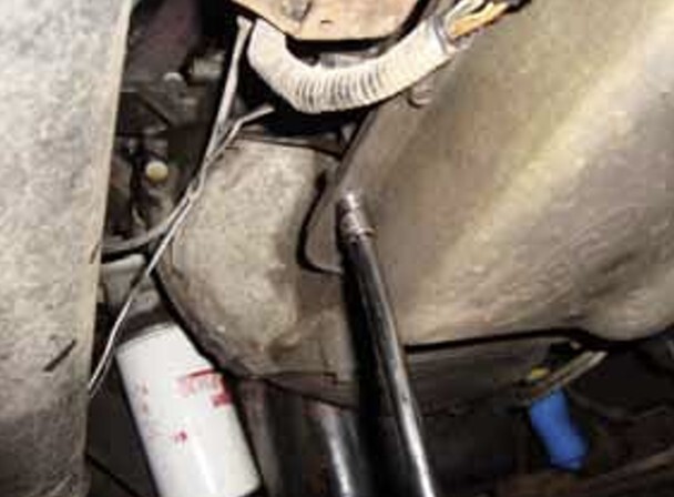 11. Refill transmission with Ford approved (Mercon/Dextron) automatic transmission fluid through dipstick tube. When the fluid level is correct, start the truck and with your foot on the brake, shift through all the gears slowly . Then place in park and check the fluid level again