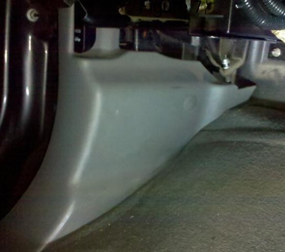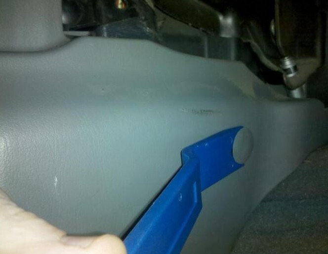 19. Remove the drivers side kick panel from behind the emergency brake pedal area. There is a large plastic push rivet that needs to be removed using a interior trim removal tool.