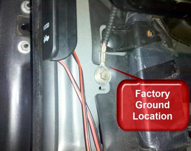 22. Locate the black ground wire and route it to a factory ground located on the side panel. Install a ring terminal that is the correct size to the ground you chose.