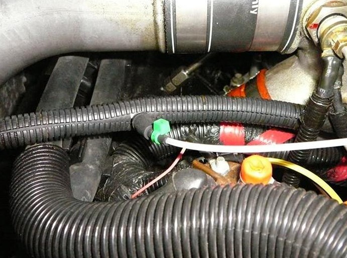 26. Route the pyrometer probe wire, the transmission temperature wire, and the boost tubing through the firewall to the engine compartment. The pyrometer wiring cannot be cut, so route enough wire to the drivers side manifold near the aft end. Coil the remaining length inside the cab and tie to the dash structure to ensure it remains clear of your feet or pedal controls. The transmission sender wire can be routed along the inside of the frame rail to the drivers side of the transmission near the shift mechanism. The boost tube should be routed along the cowl panel and to the MAP line or intake spider.