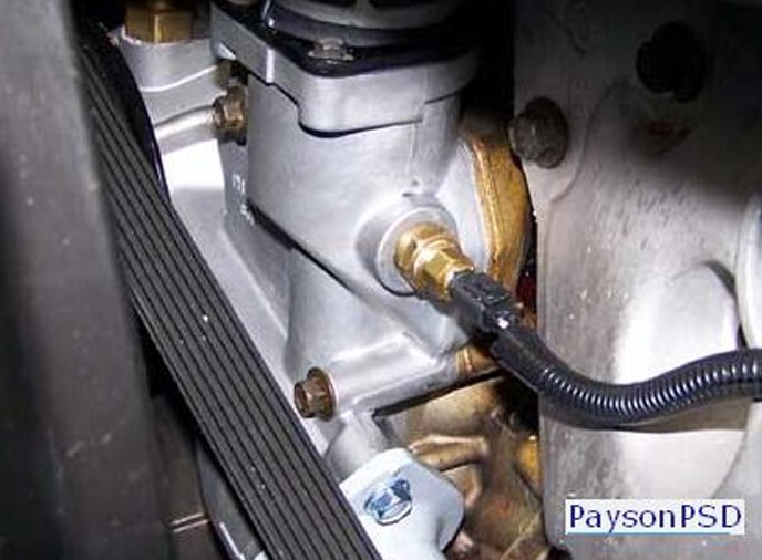 37. If you are installing a water temperature gauge you will need to mount the sender in one of the coolant ports. There is one on the water pump that offers an easy installation. Make sure the sender does not interfere with the thermostat operation, it may be required to install a short sender in this location.