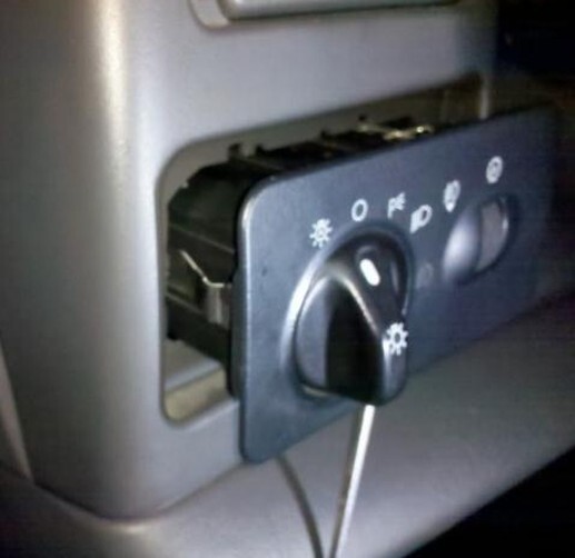 18. Remove the light control switch panel. This can be done by slipping a small common screwdriver into the slot at the bottom of the switch panel. Then apply and push the screwdriver down to disengage the retainer clips.
