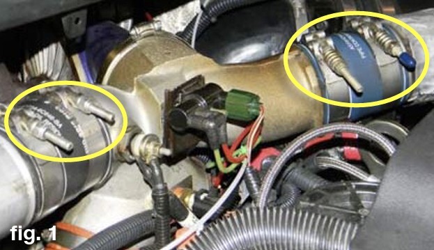 3.  Loosen the clamps from the Charge Air Cooler (CAC) boots at the intake spider on the drivers and passenger side. Slide boot off of the CAC pipe. (fig. 1)