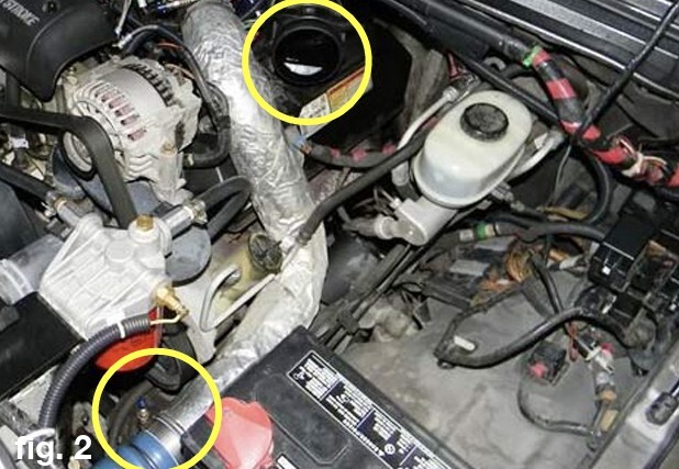 4.  Loosen the clamps from the CAC boots on the intercooler flanges (both sides). Slide the boots off of the CAC pipe. (fig. 2)