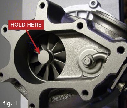 7.  Using locking pliers, grab onto the turbine wheel hub securely too lock the turbo shaft to loosen the compressor wheel.
